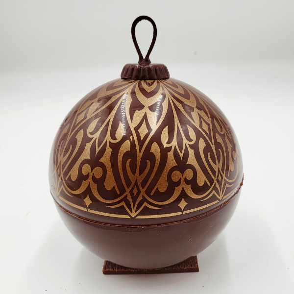 Une jolie boule de Noël au chocolat noir, garnie de gourmandises sur le thème de Noël!