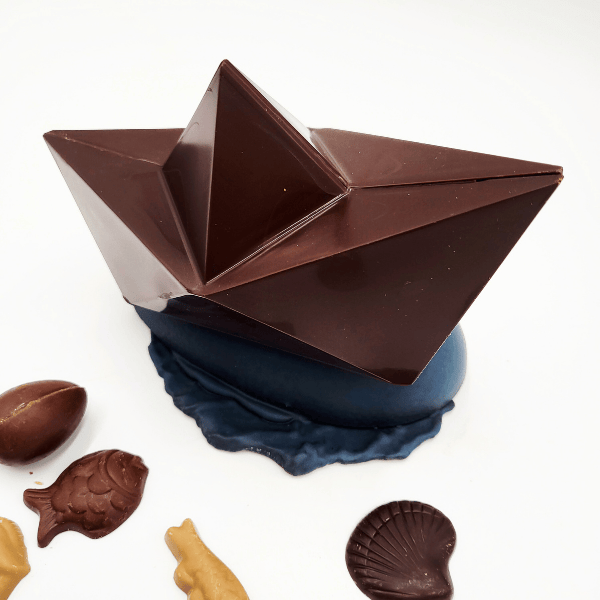 Retrouvez dans la gamme Origami les Grands Bateaux au chocolat au Lait ou au chocolat Noir, avec un socle chocolat Noir.