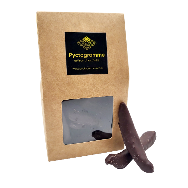 Ingrédients: orange confite, Chocolat Noir 60% minimum (fèves de cacao écalées 49% (Ghana), sucre, beurre de cacao, émulsifiant: lécithine de soja E322, Vanille Madagascar)